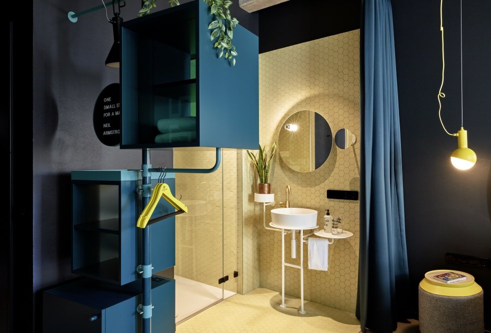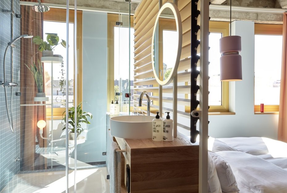 While the Inner Circle rooms create a futuristic ambience with their open room concept, the light-flooded Outer Circle rooms offer a retro atmosphere. Here, the bathrooms are located behind the beds and offer a charming view over the city while showering.