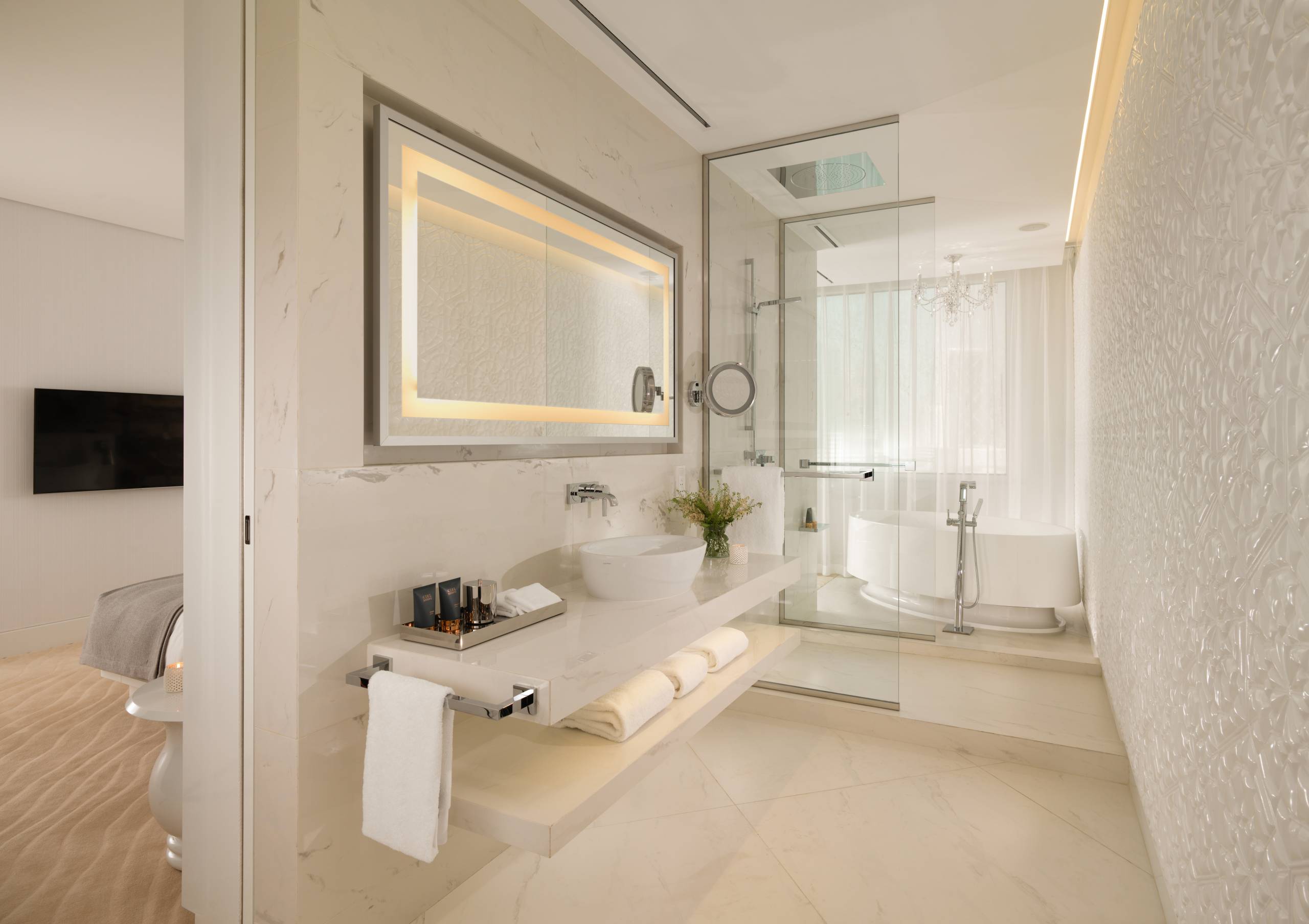 As one of the world’s leading bathroom fitters, we at LAUFEN, named for our home city of Laufen in the Basel region, are known for high-quality complete bathrooms and faucets for both, bathroom and kitchen. In addition to private homes and public facilities, we have proven our expertise in the hospitality sector, too. One of the first and most important projects was the luxurious five-star hotel, the Mondrian Doha in Qatar, which was designed by Marcel Wanders. For the 12 different types of guest rooms, LAUFEN delivered all the elements for the 270 bathrooms. As in other hospitality projects involving LAUFEN, the recipe for success called for a proven mix of serial and custom-made products.