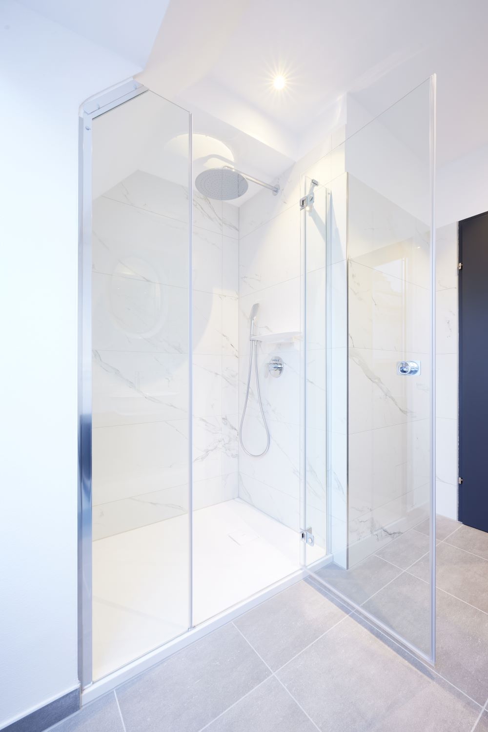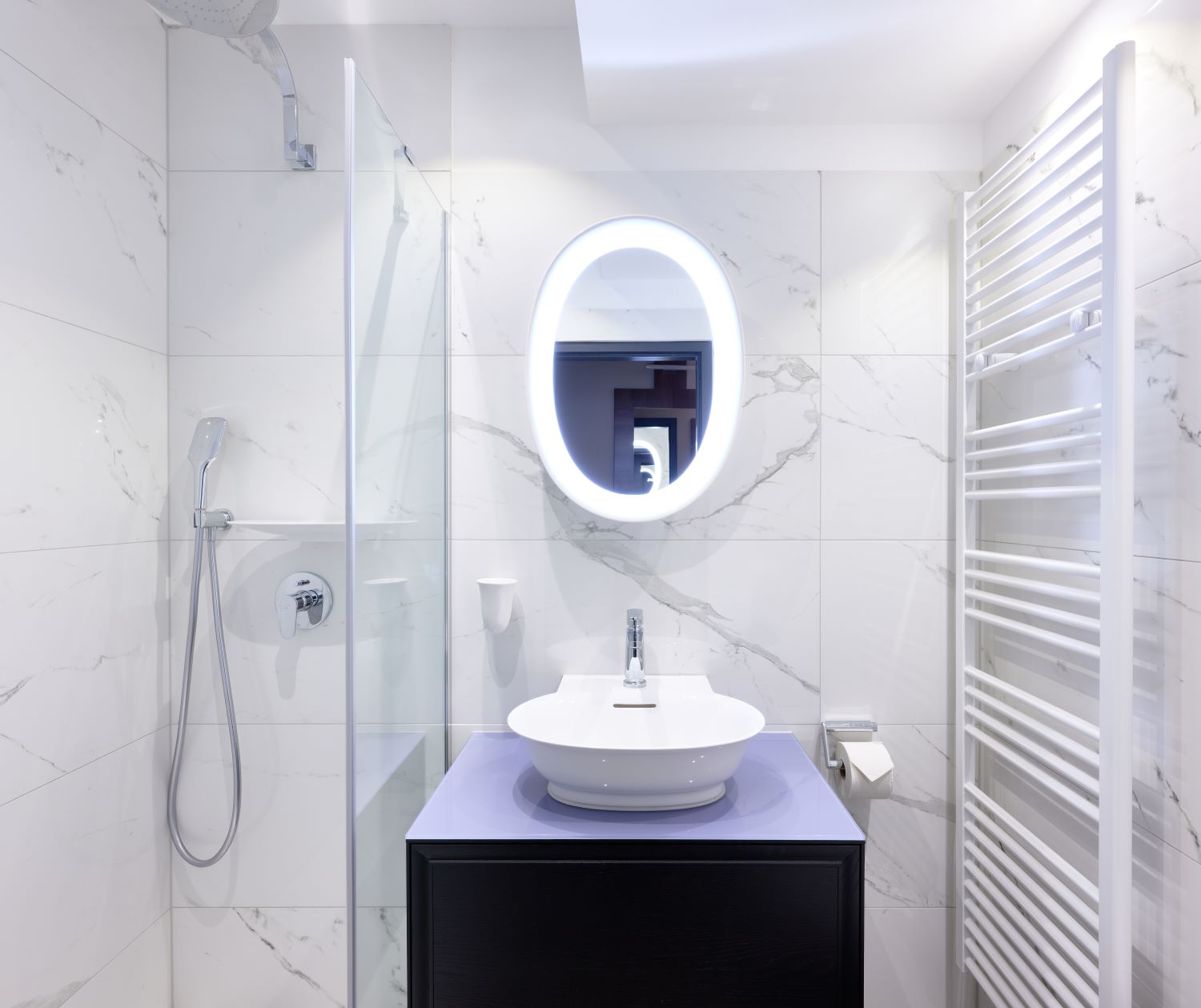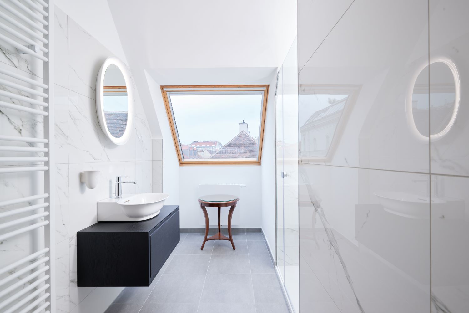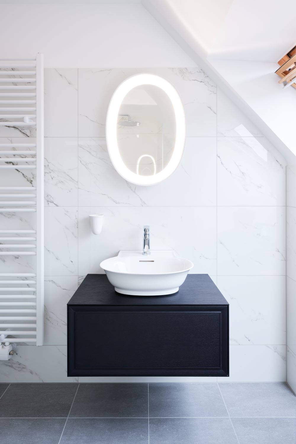 Freestanding washbasins and minimalist dark cabinets, evoke the charm of historical washstands, while the modern basin mixers add a contemporary aesthetic. The seemingly floating toothbrush holders, inspired by the form of a white tulip head, and the ceramic mirrors from the same collection, seamlessly integrate into the bathroom’s sophisticated design. Completing the ensemble are Marbond shower trays, fittings, and hand showers from LAUFEN.