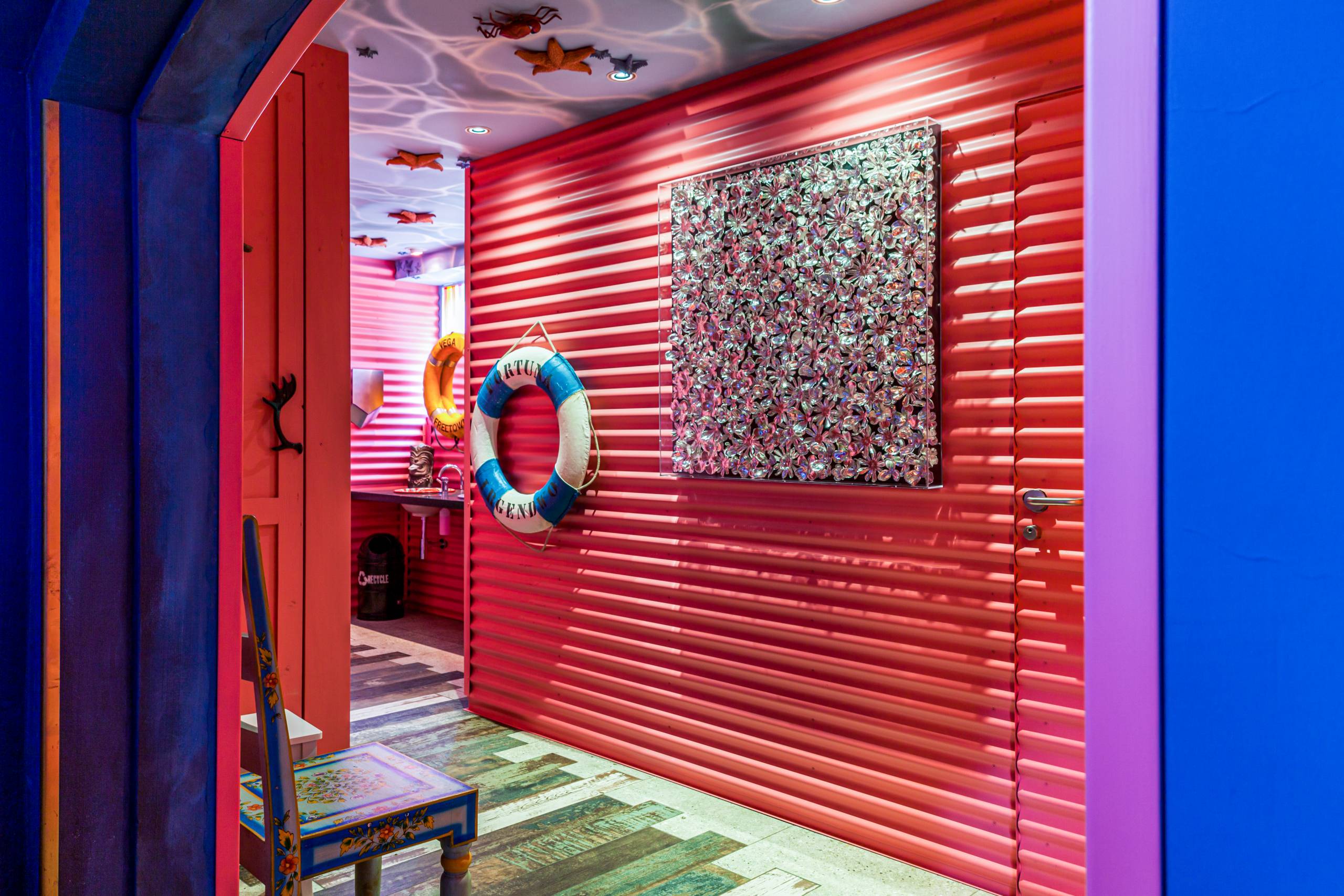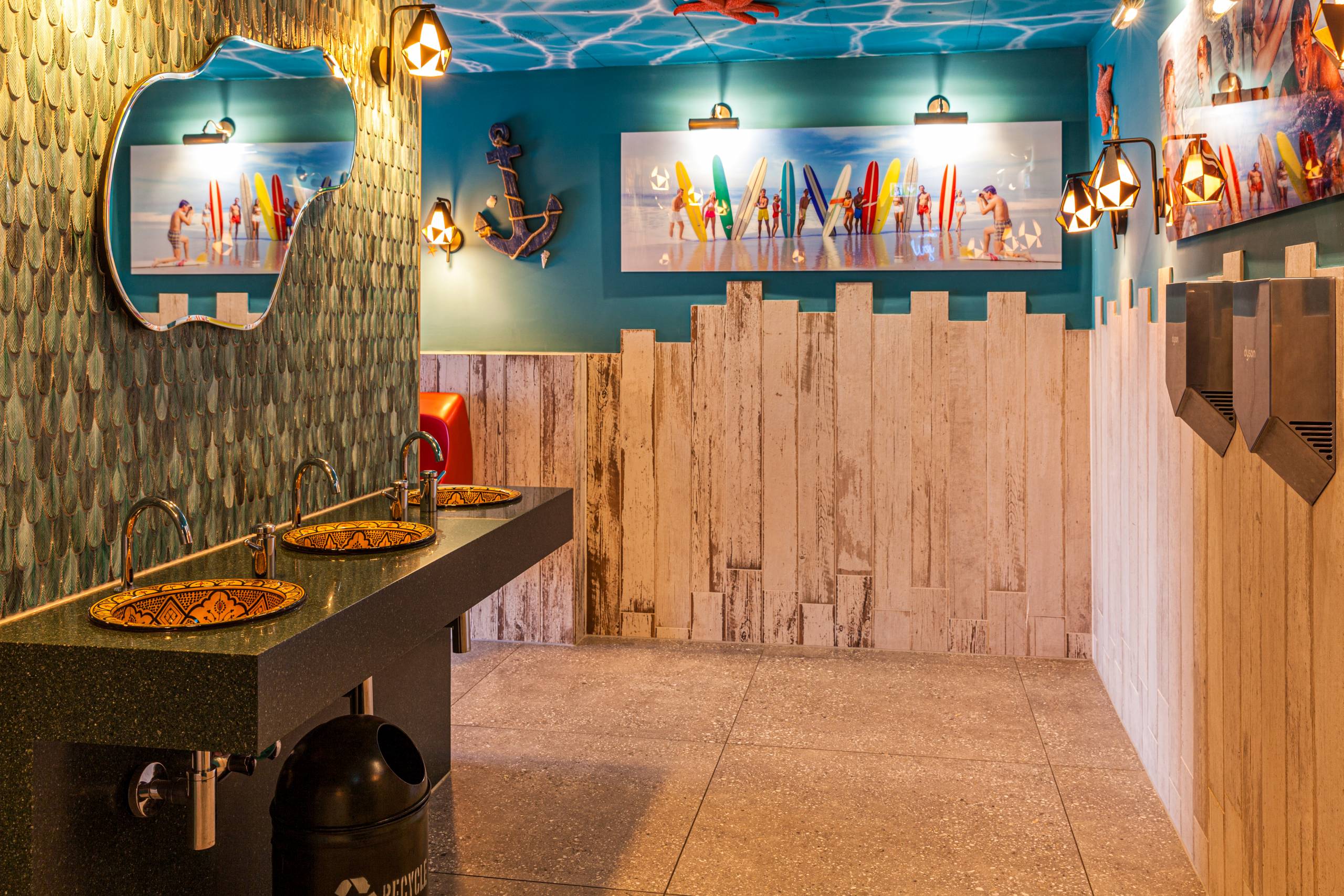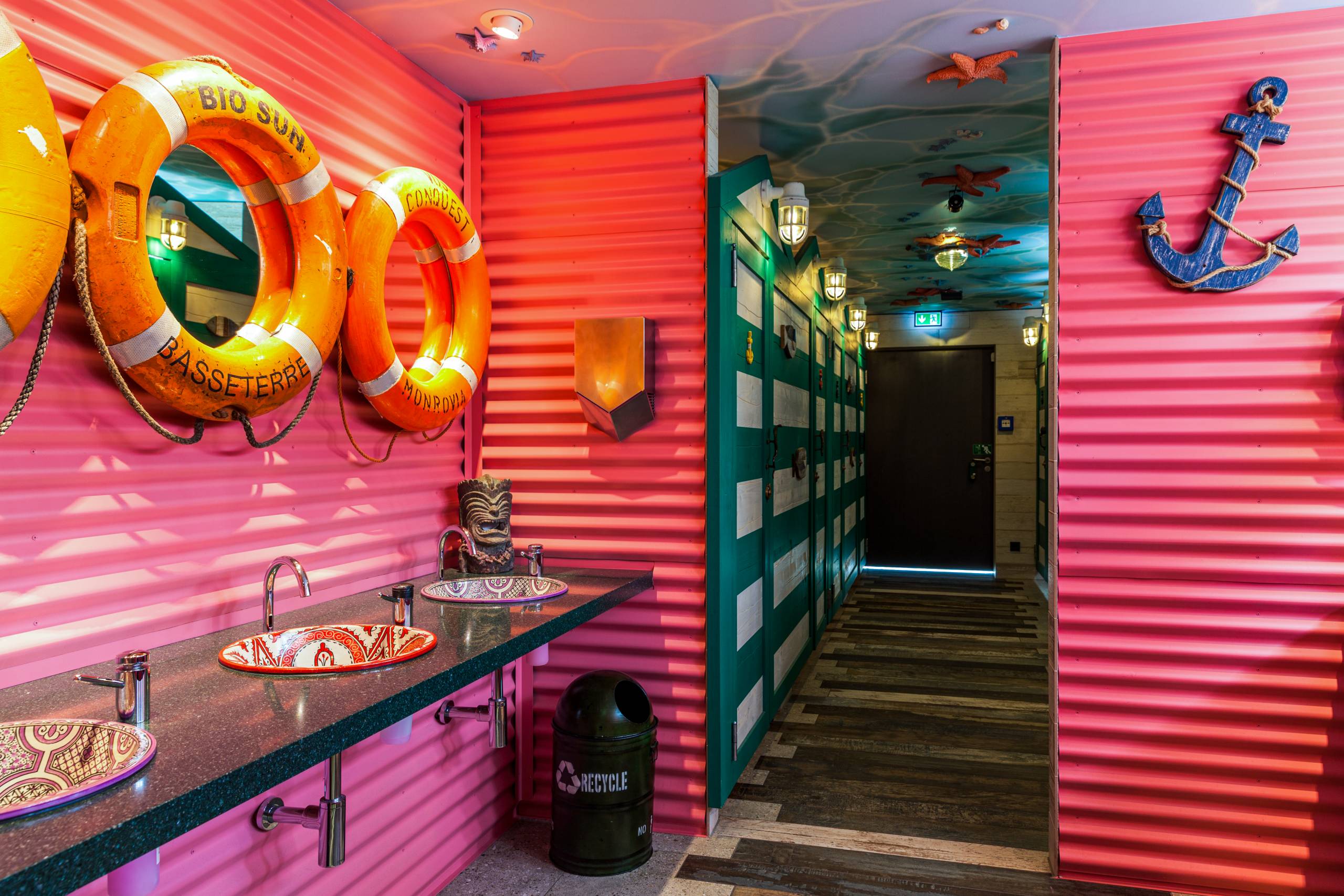 The toilets are embedded in a pleasant maritime ambience: the ceilings of the sanitary areas are reminiscent of seabeds on which the play of light and waves is reflected while small and large starfish in red and blue tones are interspersed. The toilet cubicles are designed like vintage beach changing rooms; the mirrors above the colourful vanities are framed with lifebuoys, the lights are stormproof and the walls are decorated with anchors and images of beach life.