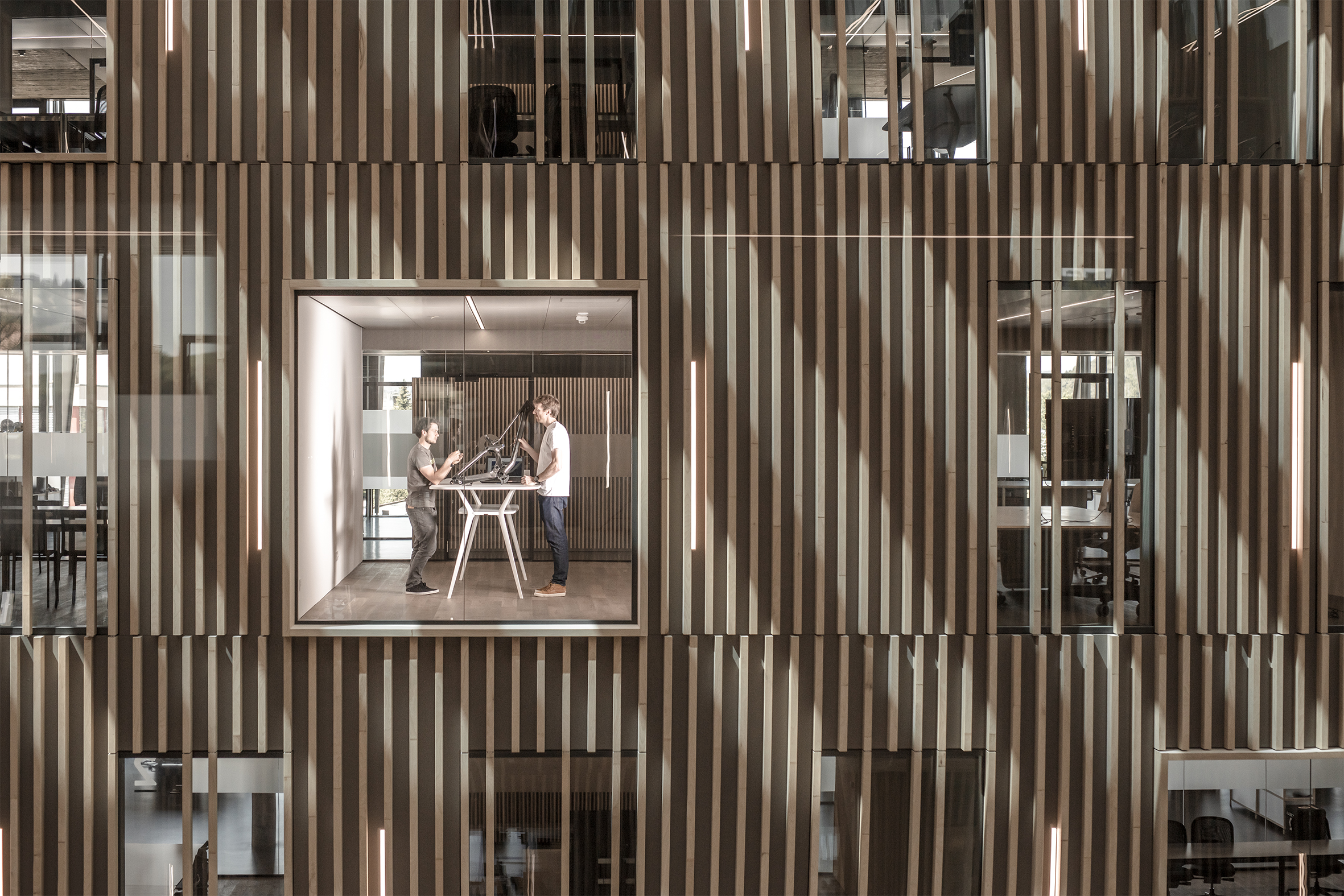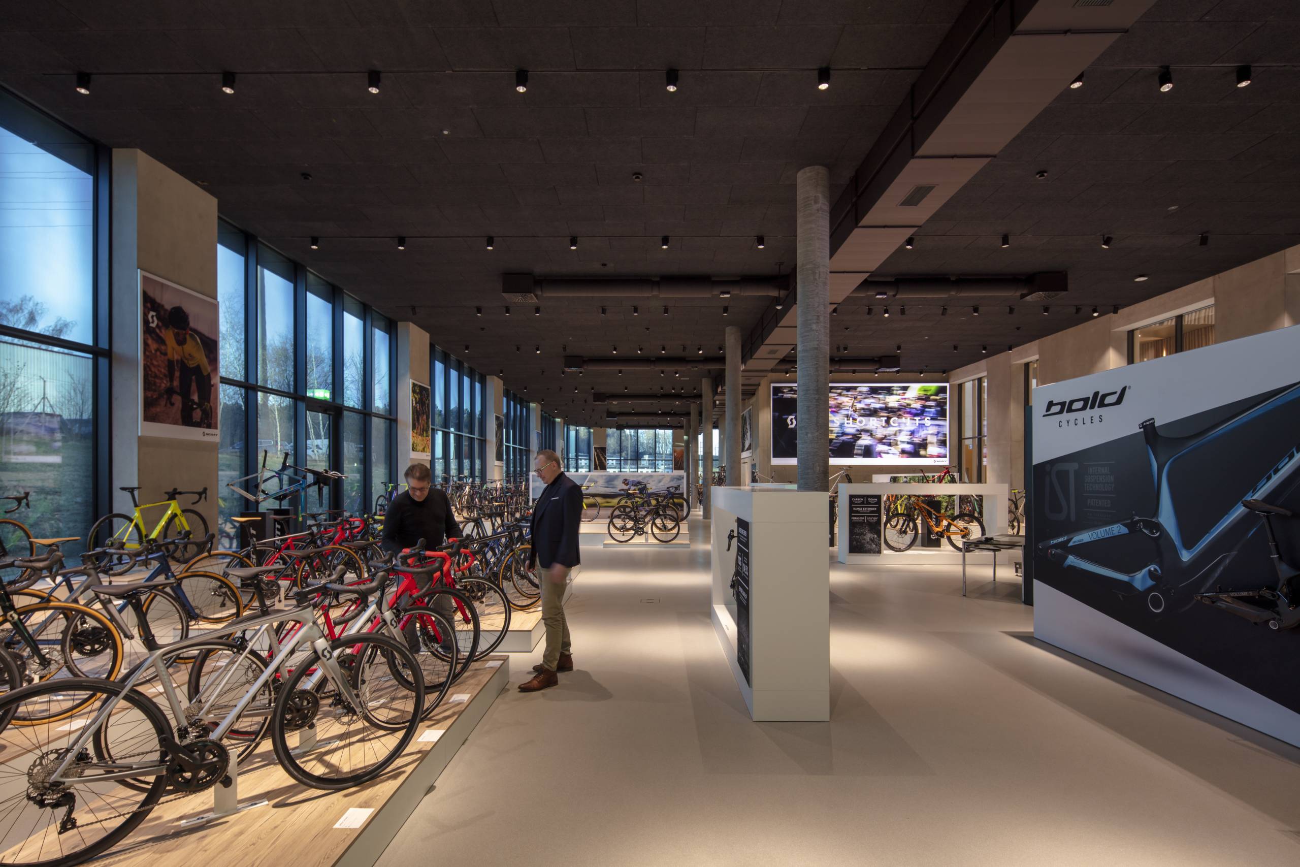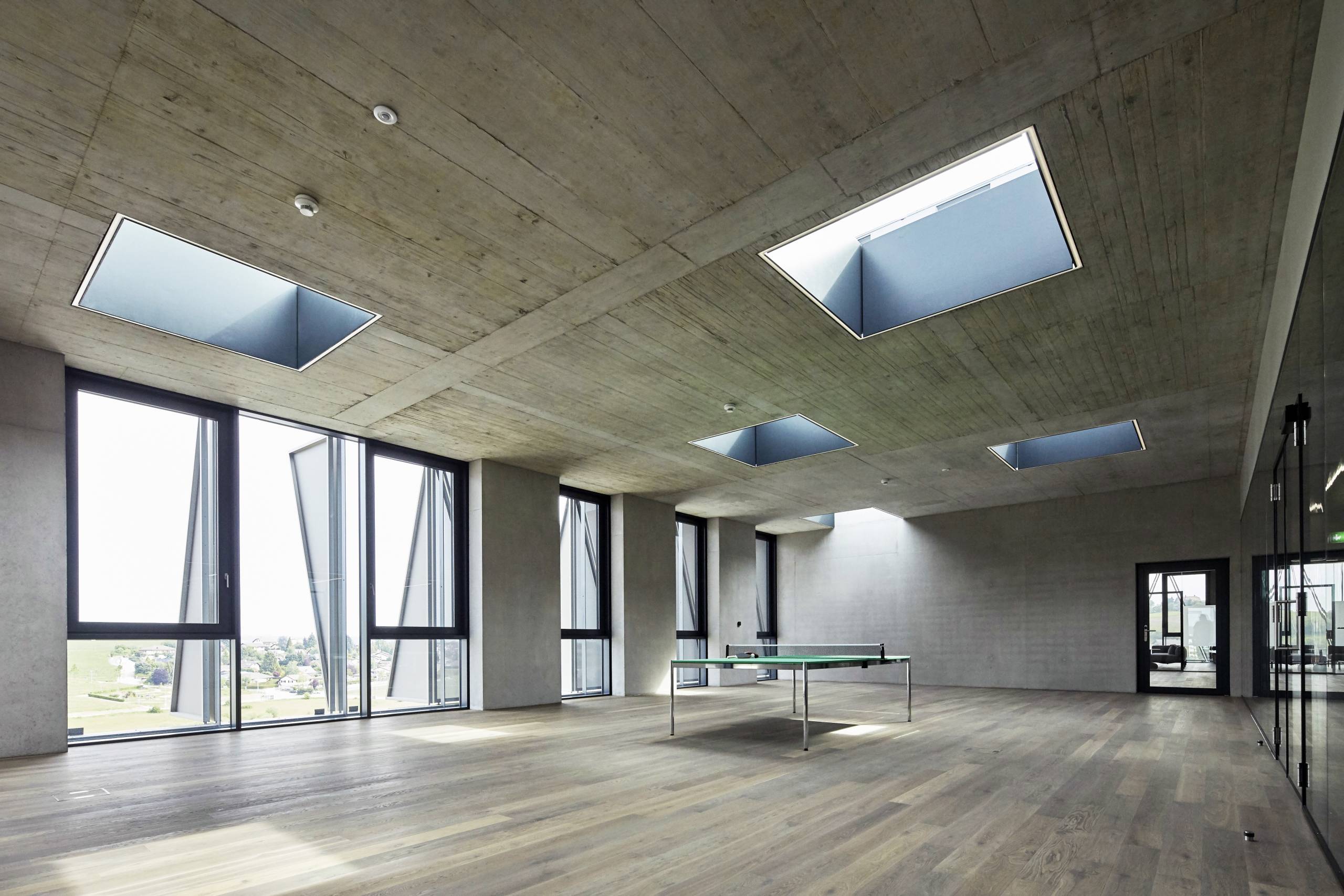The new Head Office of Scott Sports, located in Givisiez, south-west of Berne, meets all requirements imposed by the modern working world: Here, private life, office atmosphere and public areas all blend together. The sports equipment manufacturer stands for technical innovations in the areas of skiing, motocross and cycling. Cycling to work in the morning, exercising during the lunch break and taking a shower afterwards is common practice among the company staff. Due to its global success, the company’s new headquarters will attract many visitors to see the showroom with a view of the pump track, where the newly developed Scott bikes are tested.