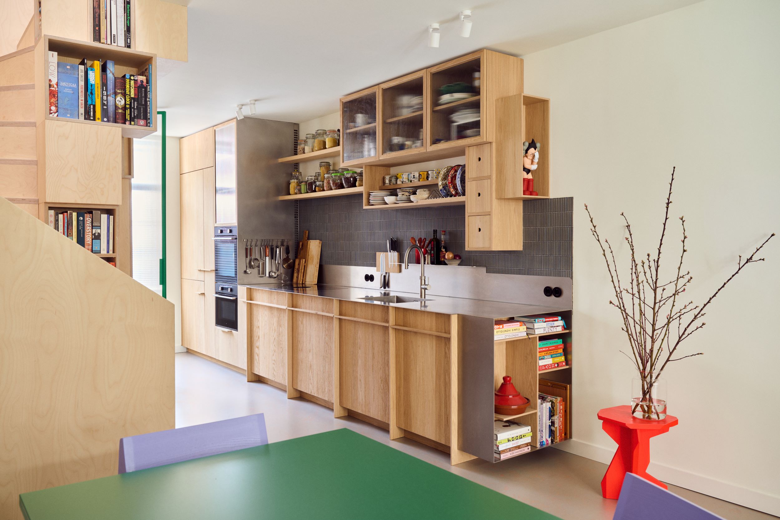 Through close collaboration with the clients, who embraced a bold and imaginative design vision, natural materials were chosen wherever possible, with birch plywood - a favourite of the clients - taking centre stage. This versatile material forms a central design language, incorporated into key elements such as the staircase, utility spaces, and bookshelves. Contrasting with this are custom-designed oak elements, including the kitchen, TV unit, and a cosy seating nook, which extends to a large window offering a direct connection to the garden.