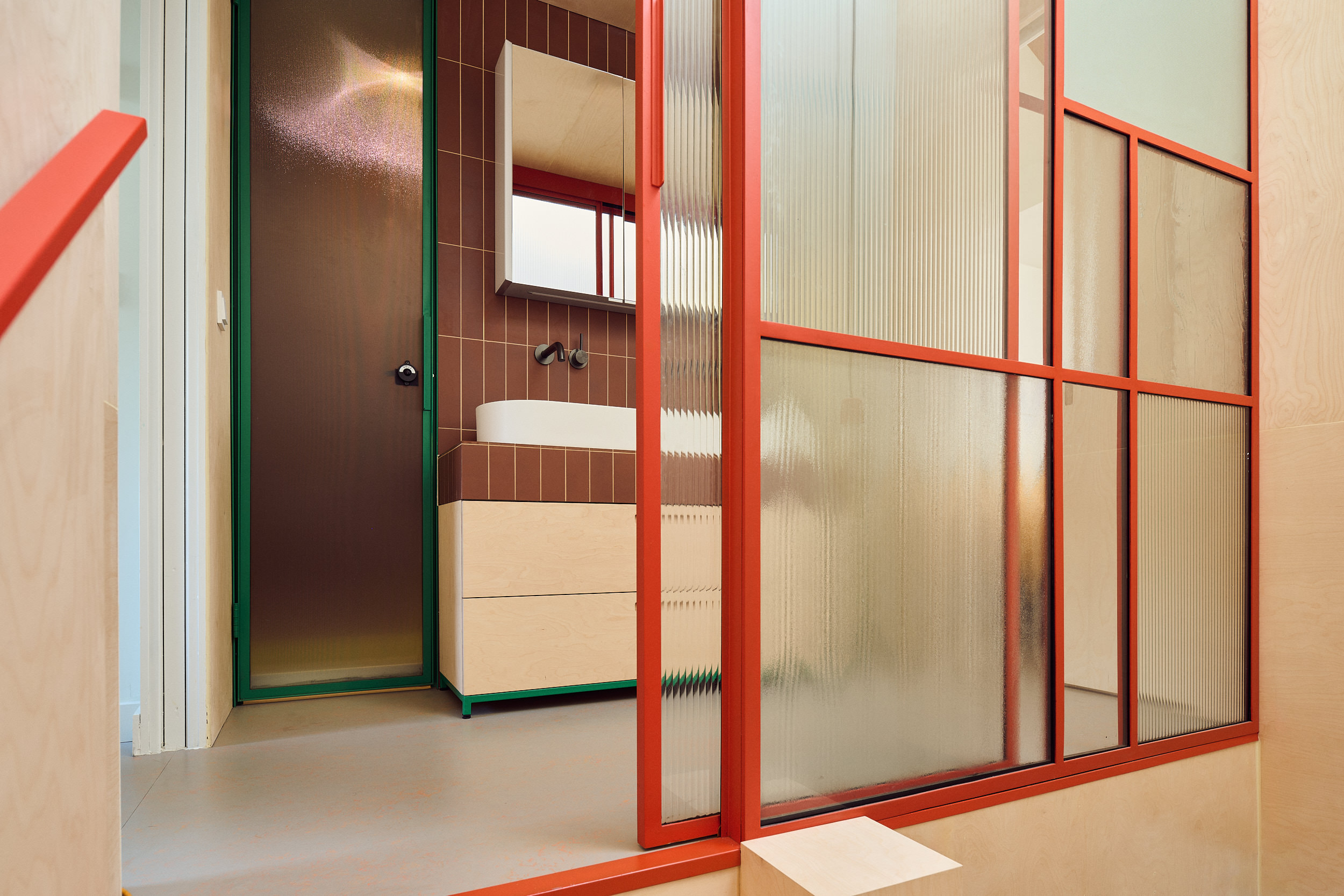 The upper floor is cleverly divided by a wet area enclosed in ribbed glass within steel frames, balancing modernity with respect for the industrial past. It is here that the Sonar double washbasin, designed by Patricia Urquiola for LAUFEN, provides ample space for bathroom rituals.