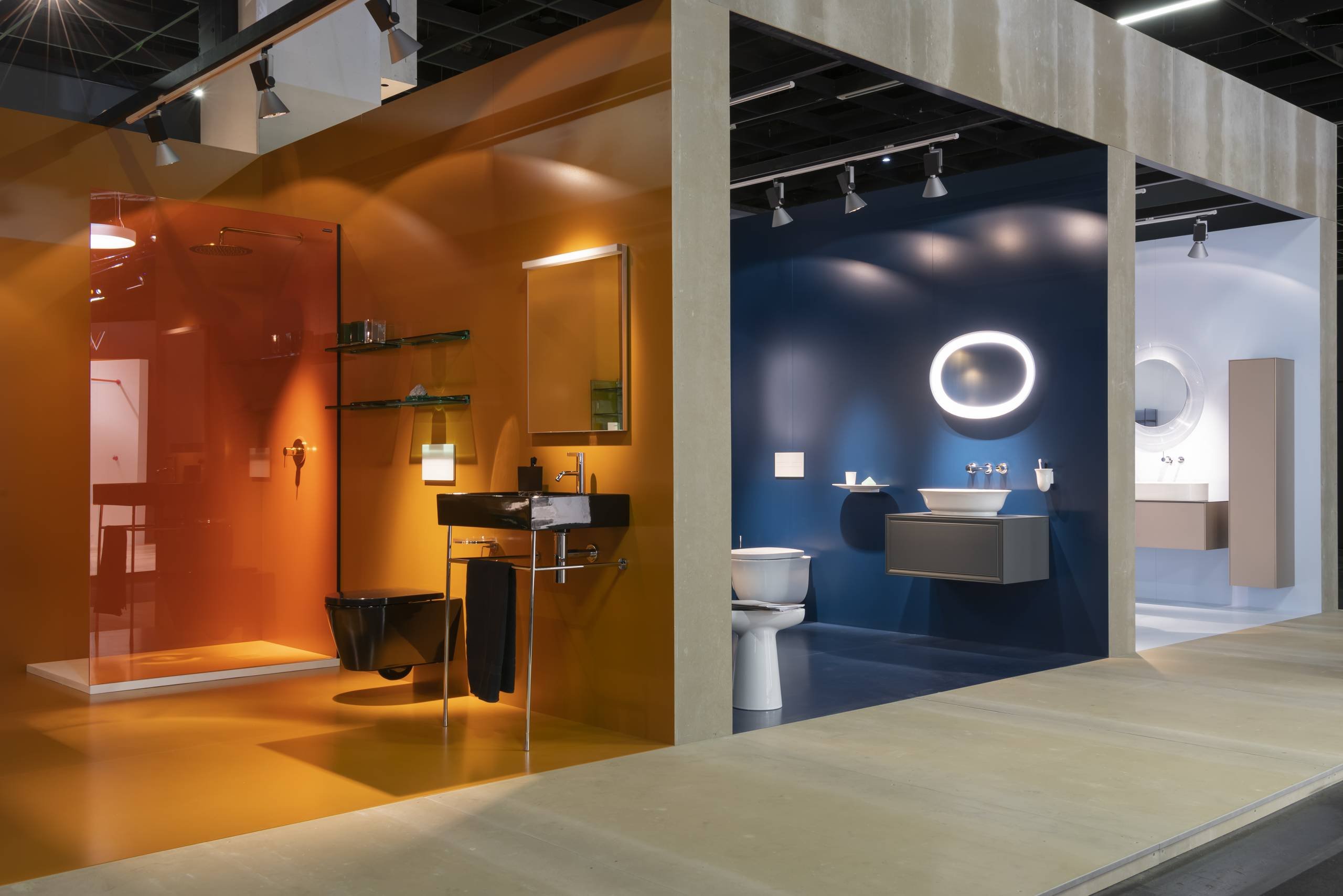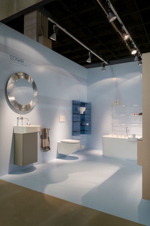 The booth has been designed as a big concrete box open on one side with a partition wall in concrete separating this open area from four rooms with high-gloss surfaces showcasing different bathroom scenarios.