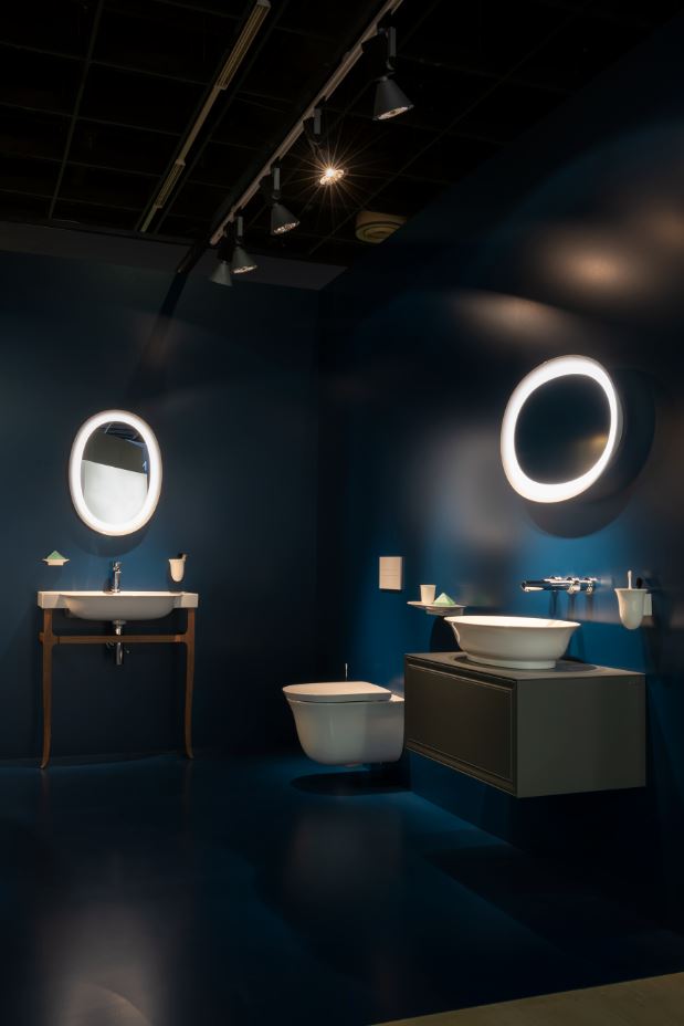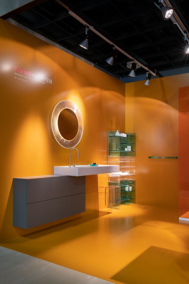 The blue setting hosts the New Classic collection designed by Marcel Wanders, the light blue one is for the Sonar line designed by Patricia Urquiola while the colourful range Kartell by Laufen designed by duo Palomba Serafini Associati is set in an elegant ochre space.