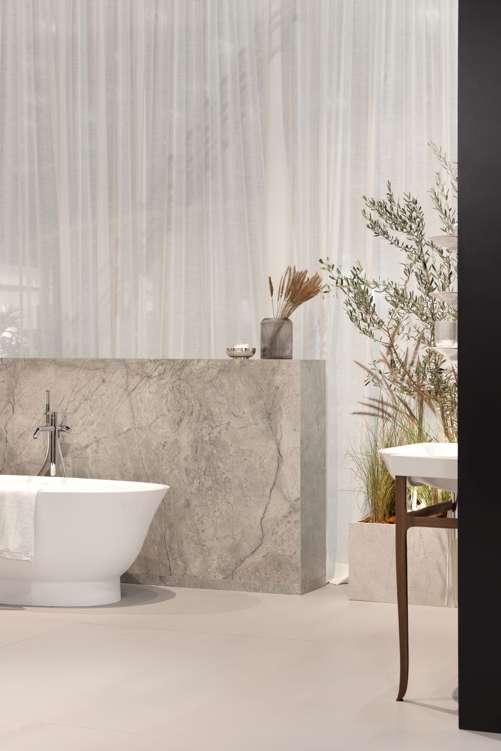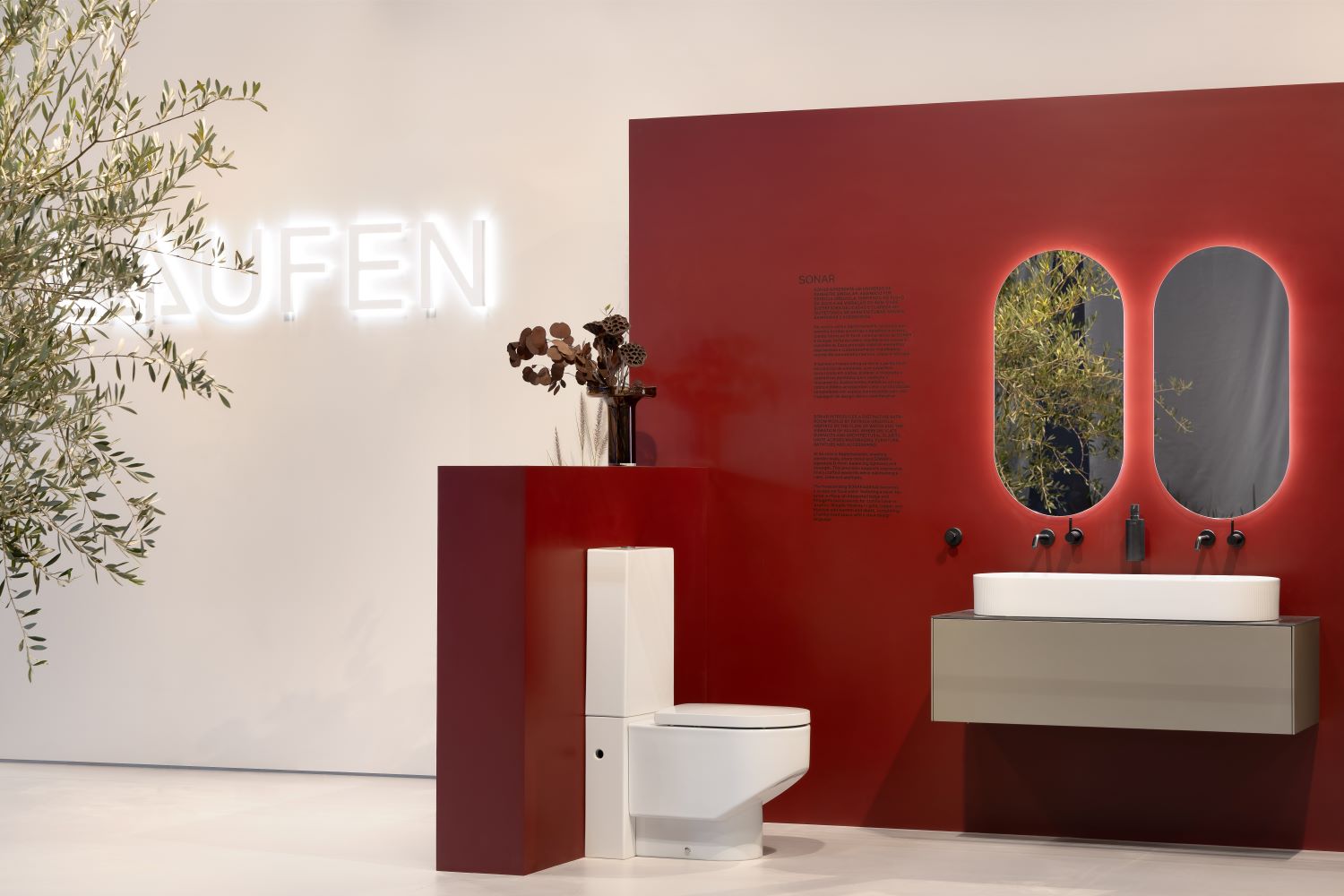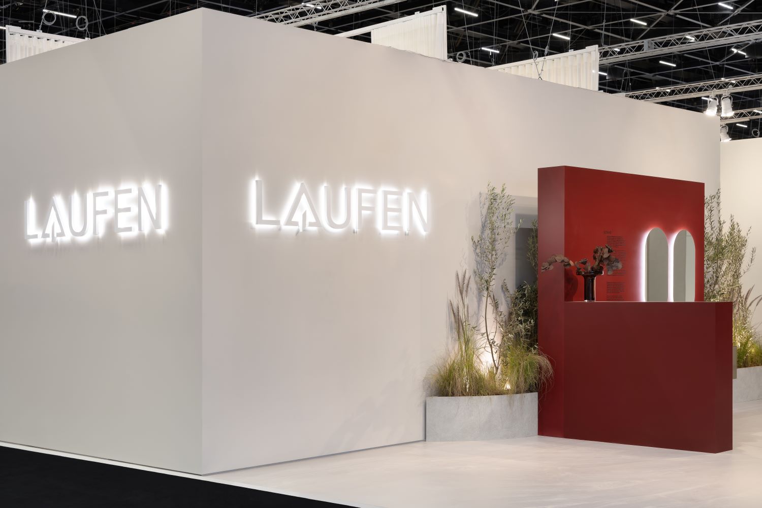The concept of the stand drew inspiration from the idea of a contemporary oasis. Soft volumes, diffused lighting and a subtle integration of natural elements created a quiet and reflective atmosphere. Within this setting, LAUFEN’s products were presented not as isolated objects but as components of a coherent architectural system, illustrating LAUFEN’s approach to the bathroom as an integrated living space.