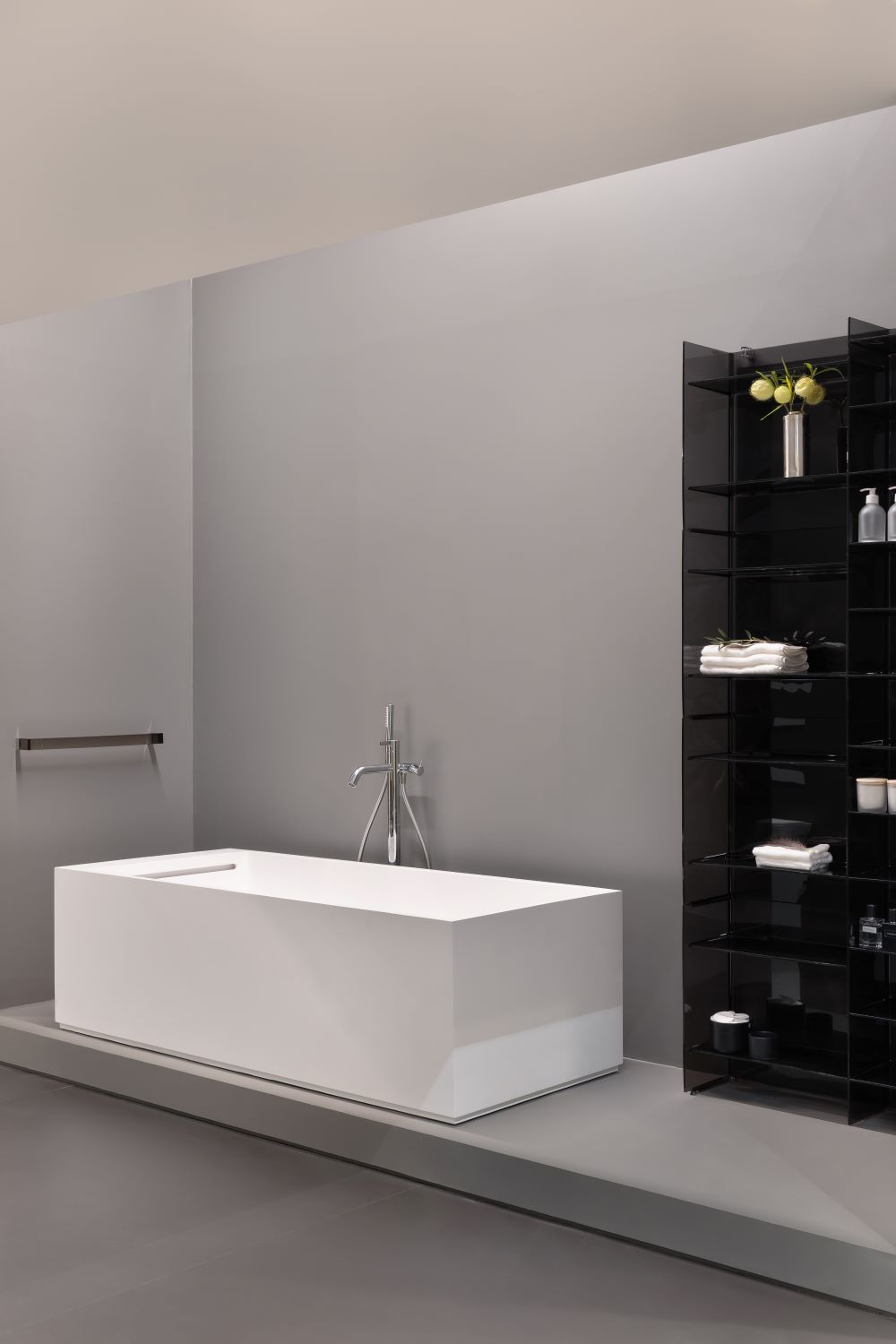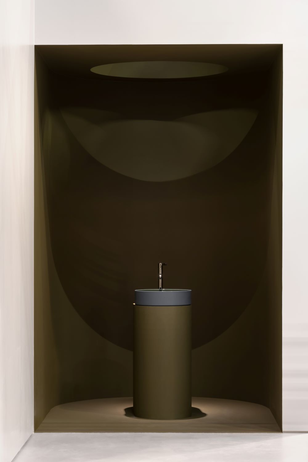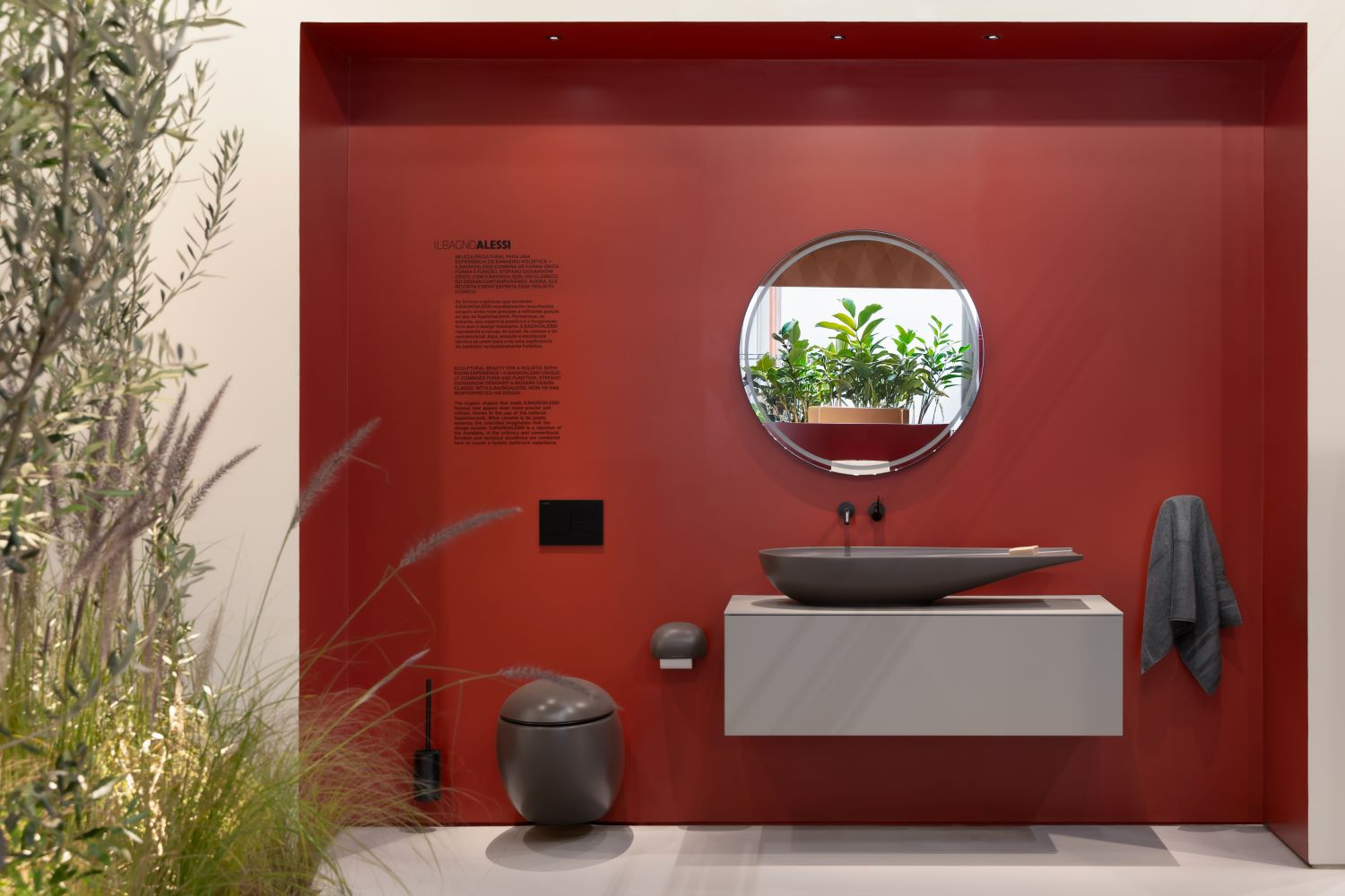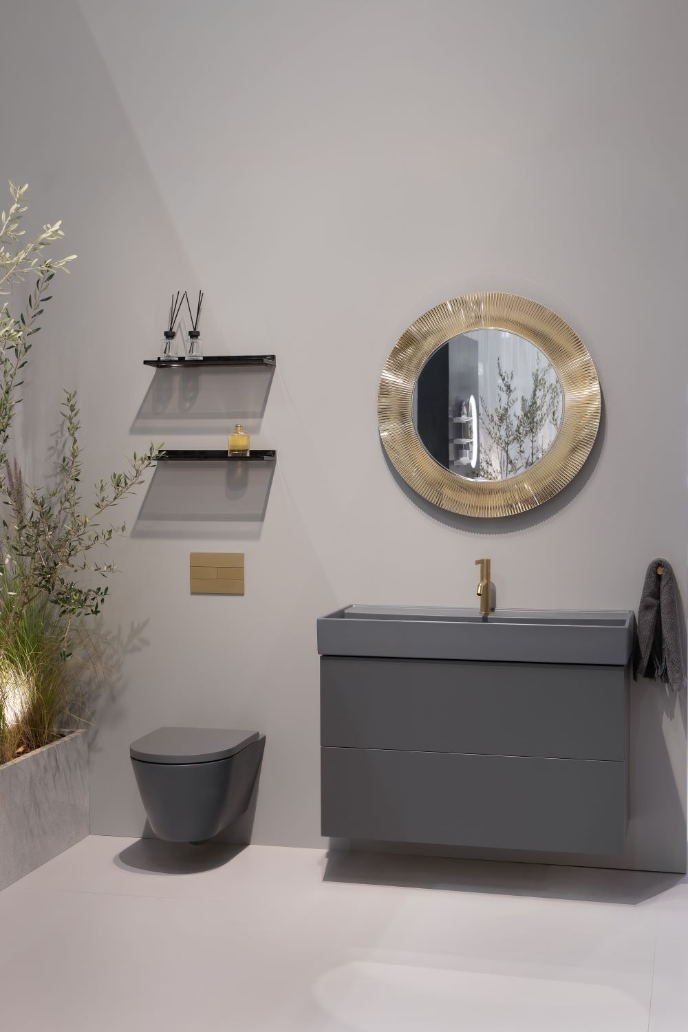 The concept of the stand drew inspiration from the idea of a contemporary oasis. Soft volumes, diffused lighting and a subtle integration of natural elements created a quiet and reflective atmosphere. Within this setting, LAUFEN’s products were presented not as isolated objects but as components of a coherent architectural system, illustrating LAUFEN’s approach to the bathroom as an integrated living space.