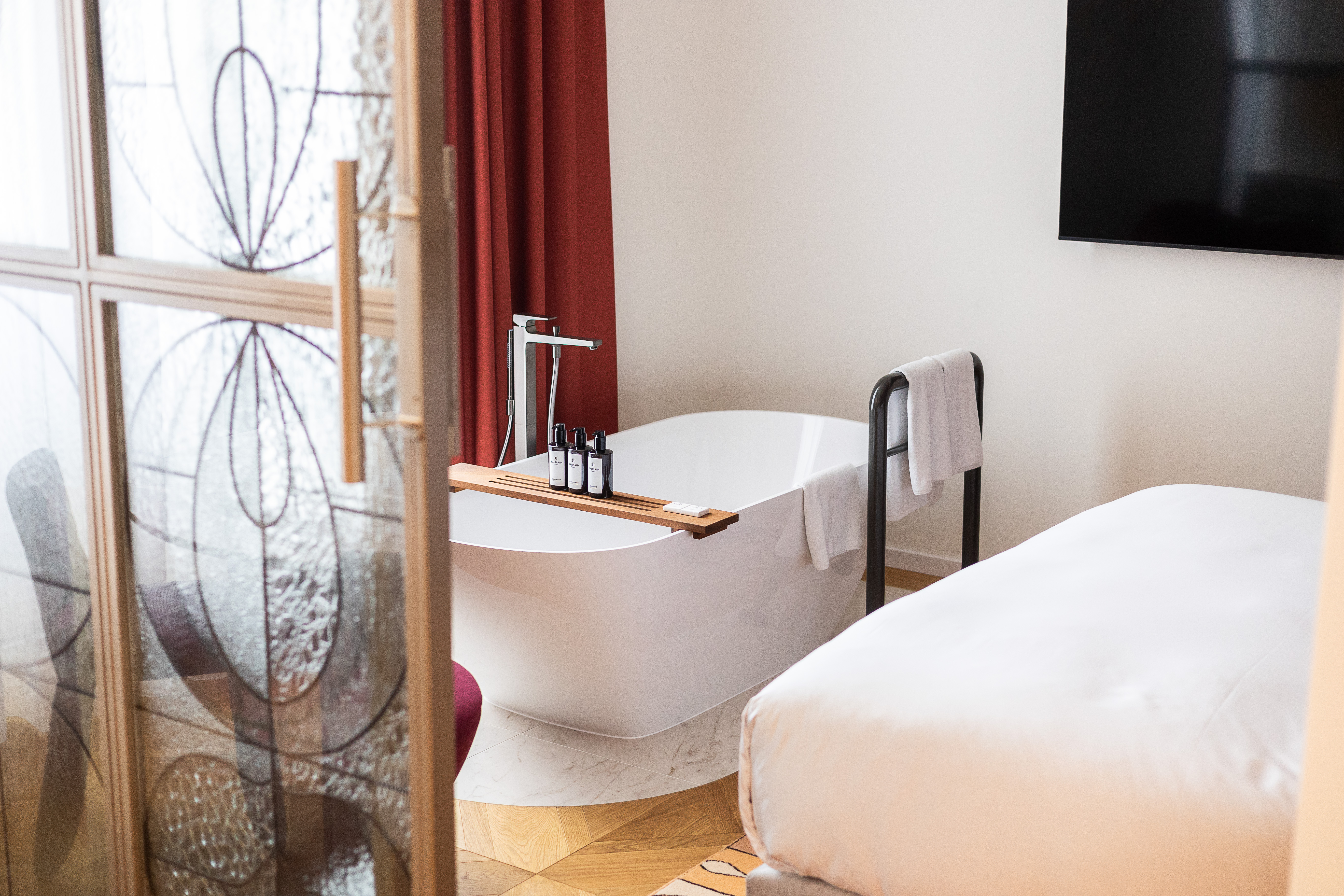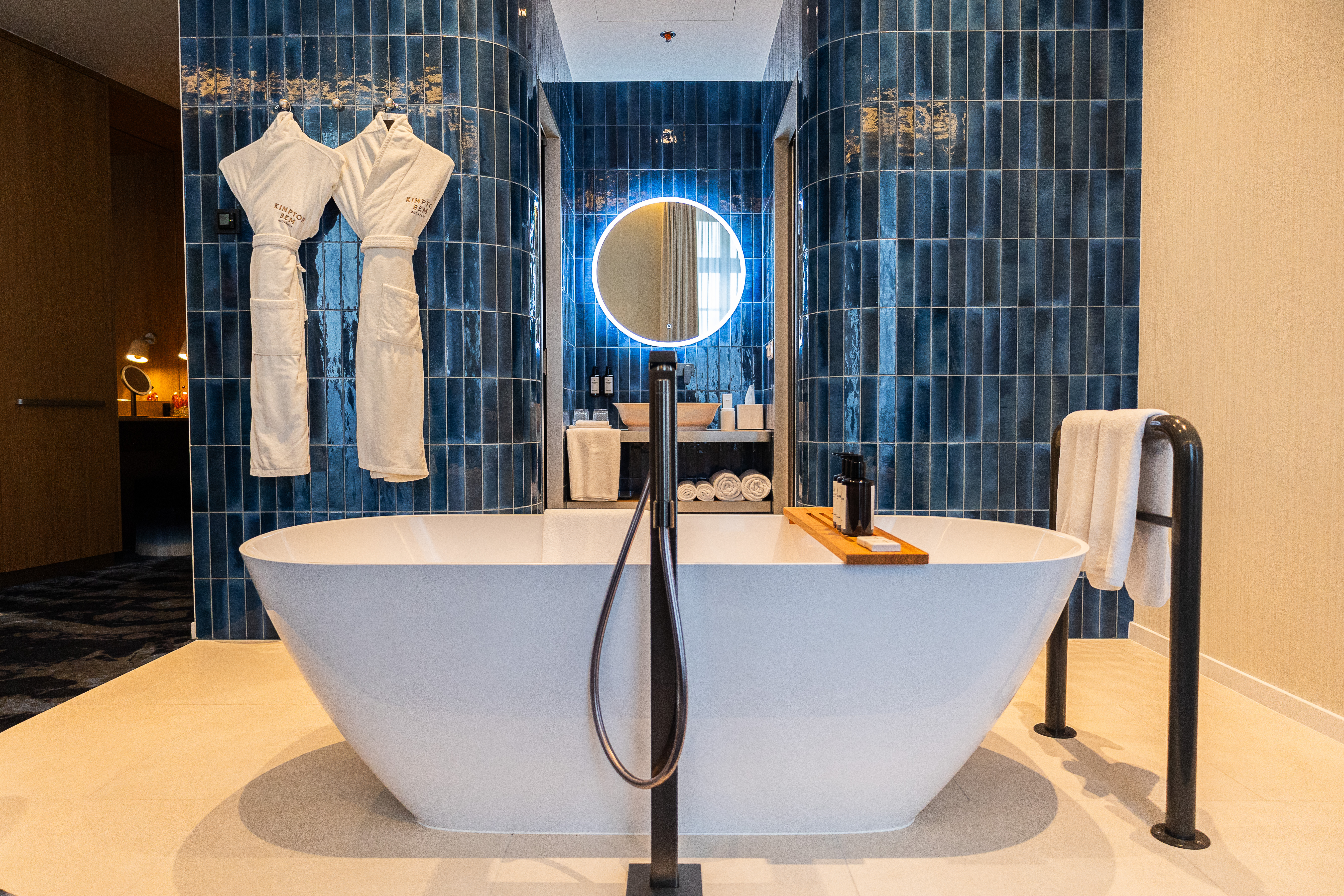 At Kimpton BEM Budapest, Marcel Wanders' enchanting design vision extends into every bathroom space, where The New Classic washbasin, along with the LUA wall-hung pan and freestanding bathtub, bring sophistication to private guest rooms and suites. Public washrooms are equally refined, featuring LAUFEN’s innovative Lema waterless urinal and Cinto urinal divider, all seamlessly integrated to embody the hotel’s blend of history and modern luxury.