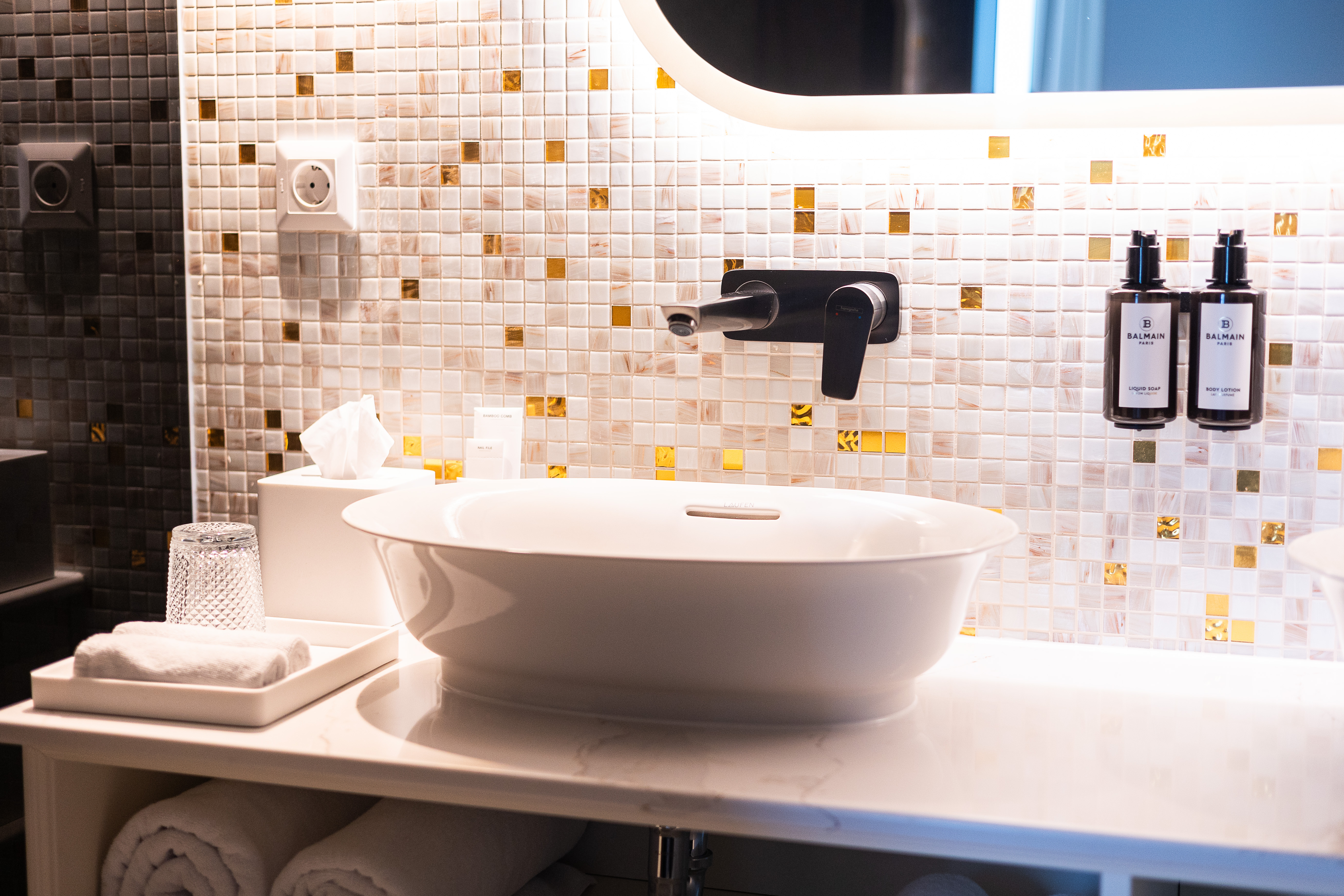 A historic Budapest mansion reimagined by Marcel Wanders, features LAUFEN in the public and private bathrooms.