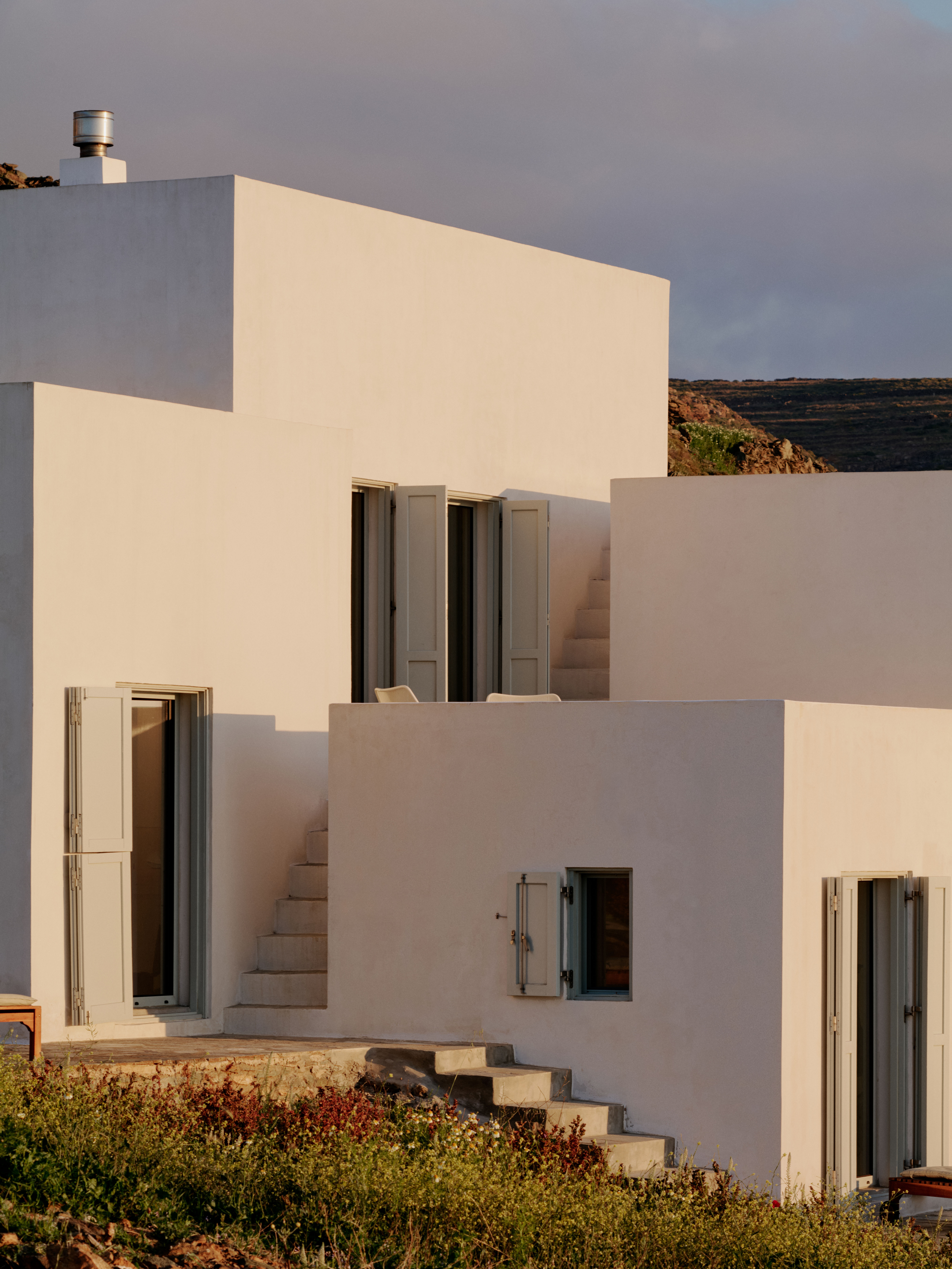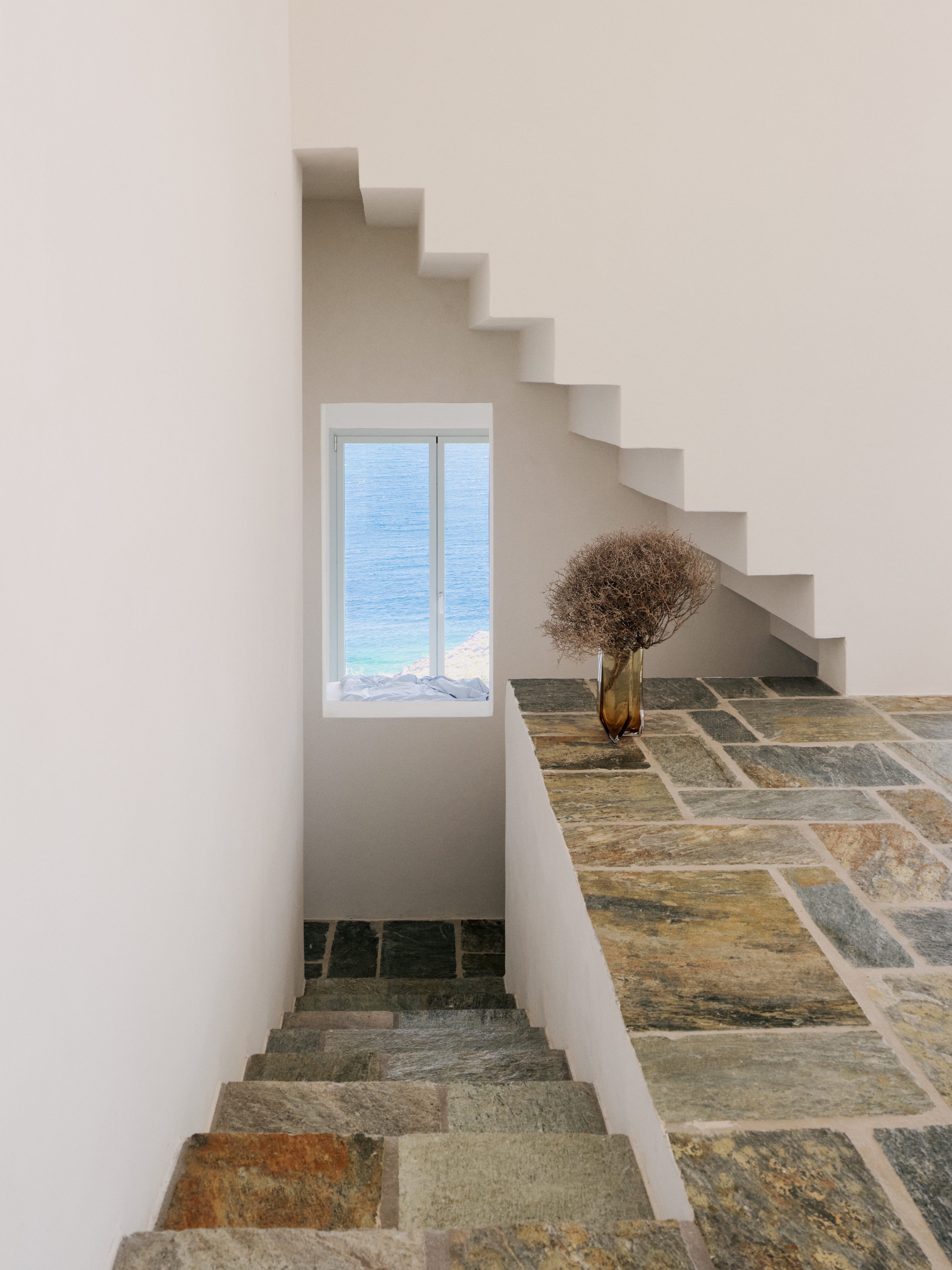 While the panoramic 200-degree views of the sea are captivating, the coastal winds are delicately managed by the clever orientation of the white cubes. Outdoor spaces are thoughtfully designed to create windless spots, ensuring comfort regardless of the wind’s direction and strength. Two staircases gracefully connect Piperi House to the sea on each side of the peninsula. One leads to the majestic cliffs on the east, where one can plunge into the crystal-clear waters, while the other path guides guests to a serene sandy beach on the southwest side.
