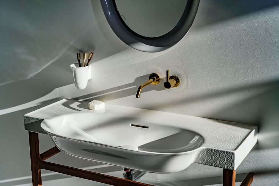 Dutch designer Marcel Wanders contributes in his unmistakable decorative language three delicate relief motivs applicated on his The New Classic collection made with Saphirkeramik. Also presented is the Falconnier Chandelier, a decidedly unusual piece from the designer’s joint work with LAUFEN. It is a tribute to the Swiss engineer Gustave Falconnier, who towards the end of the 19th century invented a technique for making glass blocks that was widely used in architecture. Wanders' chandelier consists of glass blocks made with original Falconnier molds and is complemented with blocks in Saphirkeramik in matt finish.
