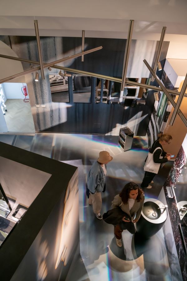 And right at the entrance of the LAUFEN space Milan, Helix, a large ceramic object catches the eye of the visitor, consisting of spiral elements made of Saphirkeramik strung on motorized steel poles, forming an elegant partition that can be opened or closed, creating different environments. The installation was developed in collaboration with the Austrian studio EOOS NEXT.